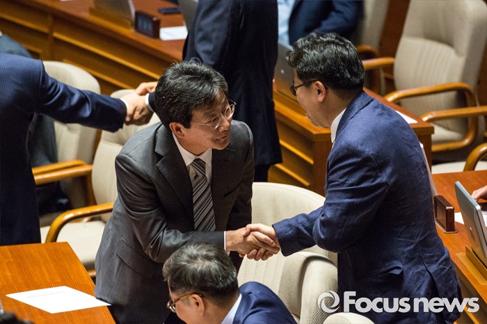 (서울=포커스뉴스) 유승민 무소속 의원이 9일 오후 서울 여의도 국회에서 열린 본회의에 참석해 동료 의원과 인사 하고 있다.