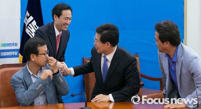 (서울=포커스뉴스) 우상호 더불어민주당 원내대표가 8일 오후 서울 여의도 국회에서 새누리당의 국회의장직을 야당이 맡고 운영 및 법사위를 여당이 맡자는 제안과 관련 논의를 위한 4선 이상 중진 의원과의 간담회에 참석해 의원들과 인사하고 있다. 왼쪽부터 원혜영 의원, 우 원내대표, 양승조, 안민석 의원.