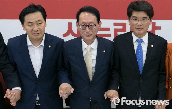 (서울=포커스뉴스) 여야 3당이 20대 국회 원구성에 합의한 8일 오후 서울 여의도 국회 새누리당 원내대표실에서 3당 원내지도부 회동 결과를 발표한 김도읍(가운데) 새누리당 원내수석부대표, 박완주(오른쪽) 더불어민주당 원내수석부대표, 김관영 국민의당 원내수석부대표가 포즈를 취하고 있다.