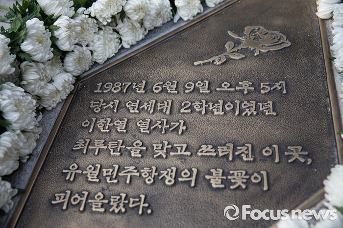 송 대변인은 "87년 6월 항쟁이 전국을 정치민주화의 함성으로 울려 퍼지게 했듯 더불어민주당은 20대 국회를 경제민주화를 요구하는 국민의 함성으로 가득 채울 것"이라며 "경제민주화를 반드시 실현해 대한민국의 새로운 역사를 써나가는 주역이 될 것임을 국민들에게 분명하게 서약한다"고 거듭 강조했다.10일 6·10 민주항쟁 제29주년을 맞이한 가운데 사진은 9일 서울 서대문구 연세대학교 정문 앞 설치된 '이한열 열사 동판'의 모습. 2016.06.09 이승배 기자