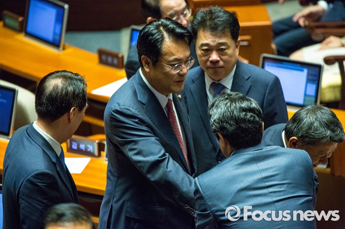 (서울=포커스뉴스) 정진석 새누리당 원내대표가 9일 오후 서울 여의도 국회에서 열린 본회의에 참석해 동료의원들과 인사 하고 있다.