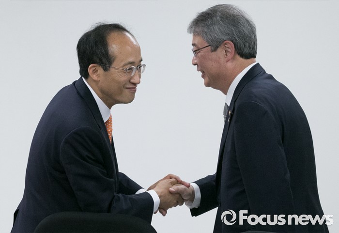 (서울=포커스뉴스) 9일 오전 서울 여의도 국회에서 열린 산업·기업 구조조정 관련 당정간담회에 참석한 국무조정실장 출신 추경호(왼쪽) 새누리당 의원과 임종룡 금융위원장이 인사하고 있다.