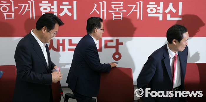 (서울=포커스뉴스) 8일 오후 서울 여의도 국회 새누리당 원내대표실에서 20대 국회 원구성 협상 등을 위한 3당 원내지도부 회동에 참석한 의원들이 합의문 작성을 위해 자리를 옮기고 있다. 이날 여야 3당은 20대 국회 원구성에 합의했다. 왼쪽부터 정진석 새누리당 원내대표, 박지원 국민의당 원내대표, 우상호 더불어민주당 원내대표.