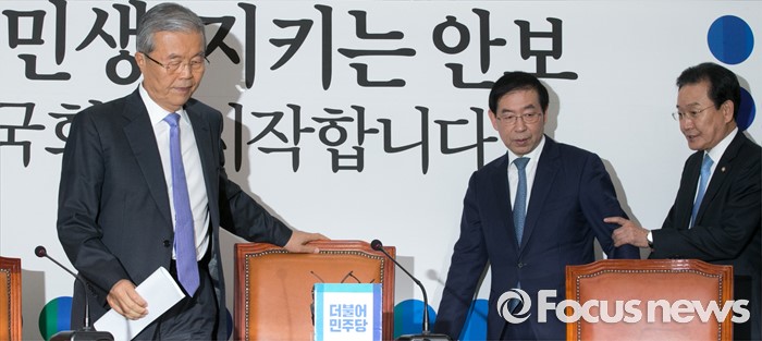 (서울=포커스뉴스) 8일 오전 서울 여의도 국회에서 구의역 스크린도어 노동자 사망 사건과 관련해 열린 더불어민주당-서울시 정책간담회에 김종인(왼쪽부터) 비대위 대표와 박원순 서울시장, 변재일 정책위의장이 참석하고 있다.