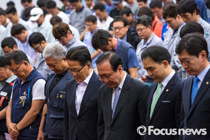 한편, 이 자리에 참석해 노조 대표로 인사말을 한 김동만 한국노총 위원장·최종진 민주노총 위원장 직무대행·백형록 조선노련 공동의장은 한 목소리로 "조선산업 구조조정의 해법을 모색하기 위한 사회적 대화를 하루빨리 시작해주시기를 바란다"고 요청했다.(서울=포커스뉴스) 박지원(오른쪽 네 번째) 국민의당원내대표와 노회찬(오른쪽 세 번째) 정의당 원내대표를 비롯한 한국노총 관계자 및 조선산업 노동자들이 9일 오전 서울 여의도 국회도서관 강당에서 열린 '위기의 조선산업 및 노동자 구조조정 해법 모색 대토론회'에 참석해 묵념 하고 있다. 2016.06.09 강진형 기자