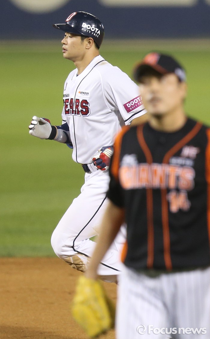 (서울=포커스뉴스) 10일 서울 잠실구장에서 열린 2016프로야구 롯데-두산 경기 6회말 무사 1,2루에서 두산 김재환이 우월 3점 홈런을 치고 그라운드를 달리고 있다.