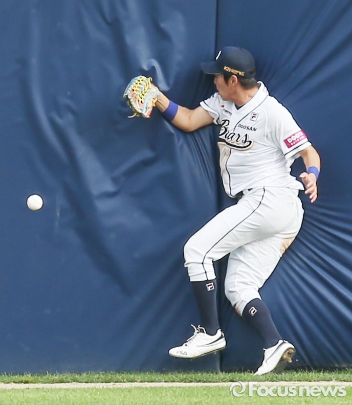 (서울=포커스뉴스) 12일 서울 잠실구장에서 열린 2016 프로야구 롯데-두산 경기 3회초 두산 중견수 정수빈이 롯데 선두타자 아두치의 타구를 놓치면서 펜스에 부딪히고 있다.