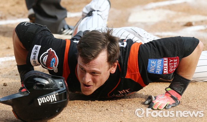 (서울=포커스뉴스) 12일 서울 잠실구장에서 열린 2016 프로야구 롯데-두산 경기 3회초 롯데 선두타자 아두치가 중견수를 넘기는 3루타와 송구 실책을 틈타 홈까지 달려 슬라이딩하며 세이프되고 있다.