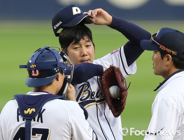(서울=포커스뉴스) 12일 서울 잠실구장에서 열린 2016 프로야구 롯데-두산 경기 8회초 2사후 안타를 맞은 두산 투수 장원준에게 한용덕 코치가 마운드에 올라가 안정시키고 있다.