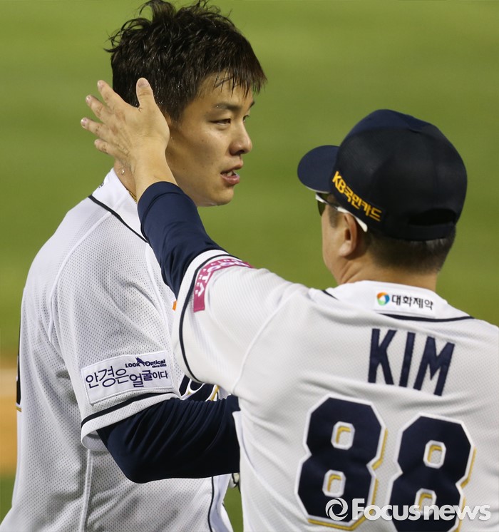 (서울=포커스뉴스) 12일 서울 잠실구장에서 열린 2016 프로야구 롯데-두산 경기에서 두산 김태형 감독이 연장 11회말 끝내기 2루타를 친 민병헌의 머리를 쓰다듬으며 축하하고 있다.