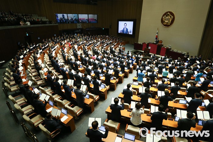 (서울=포커스뉴스) 13일 오전 서울 여의도 국회에서 열린 20대 국회 개원식에 참석한 의원들이 선서를 하고 있다.