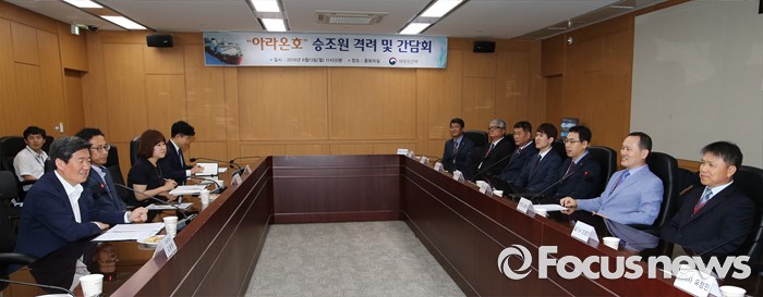 (세종=포커스뉴스) 윤학배(왼쪽) 해양수산부 차관이 13일 오전 세종시 정부세종청사 해수부 중회의실에서 열린 아라온호 승조원 격려 및 간담회에서 인사말을 하고 있다.