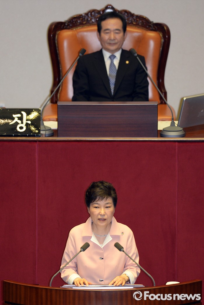 (서울=포커스뉴스) 박근혜 대통령이 13일 오전 서울 여의도 국회에서 열린 20대 국회 개원식에 참석해 연설을 하고 있다.