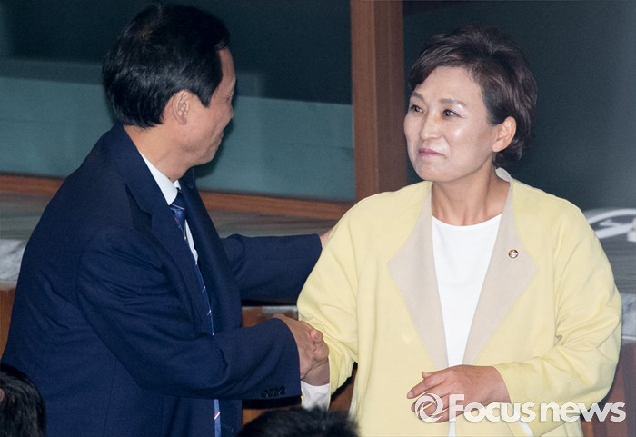 우상호 축하 받는 김현미 신임 예결위원장