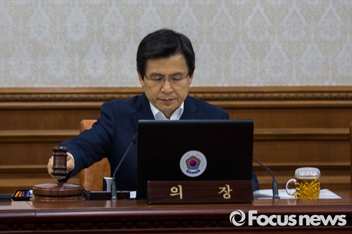 (서울=포커스뉴스) 14일 오전 서울 종로구 정부서울청사에서 열린 국무회의에 참석한 황교안 국무총리가 의사봉을 두드리고 있다.