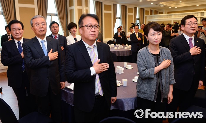 (서울=포커스뉴스) 김종인(왼쪽 두번째) 더불어민주당 비대위 대표 등 의원들이 14일 오전 서울 여의도 국회 귀빈식당에서 열린 보훈단체장과의 간담회에 참석해 국기에 대한 경례를 하고 있다.