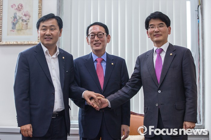 (서울=포커스뉴스) 14일 오전 서울 여의도 국회에서 3당 원내수석이 회동에 앞서 손을 맞잡고 있다. 왼쪽부터 김관영 국민의당 원내수석부대표, 김도읍 새누리당 원내수석부대표, 박완주 더불어민주당 원내수석부대표.