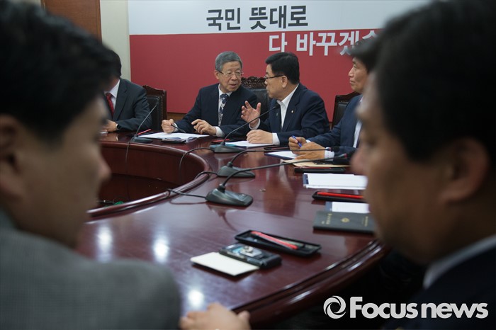 (서울=포커스뉴스) 김희옥(오른쪽 네번째)새누리당 혁신비상대책위원장과 김광림(오른쪽 세번째) 정책위의장이 14일 오후 서울 여의도 국회에서 열린 혁신비상대책위원 회의에서 대화하고 있다.