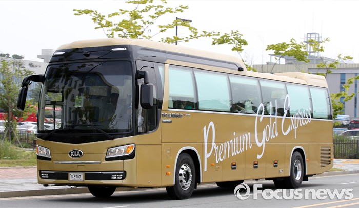 (세종=포커스뉴스) 프리미엄 고속버스 도입에 앞서 시승행사가 14일 오전 세종시 정부세종청사 제2주차장에서 열렸다. 사진은 기아자동차 뉴 그랜버드 프리미엄 골드 익스프레스 외부모습.