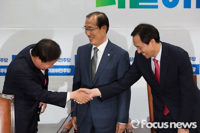 (서울=포커스뉴스) 우상호(오른쪽) 더불어민주당 원내대표가 14일 오후 서울 여의도 국회에서 김재원(왼쪽) 청와대 정무수석과 면담에 앞서 악수 하고 있다.
