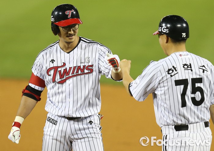 (서울=포커스뉴스) 14일 서울 잠실구장에서 열린 2016 프로야구 NC-LG 경기 6회말 2사 2루에서 LG 박용택이 중전 안타로 주자를 불러 들이고 한혁수 코치의 축하를 받고 있다.