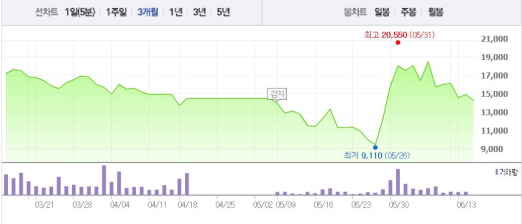 현대상선은 해외 선주들에게 3년 반 동안 내야할 용선료(2조500억원)의 21%인 5300억원 인하 합의를 발표했다.주가흐름<사진출처=네이버 캡쳐>