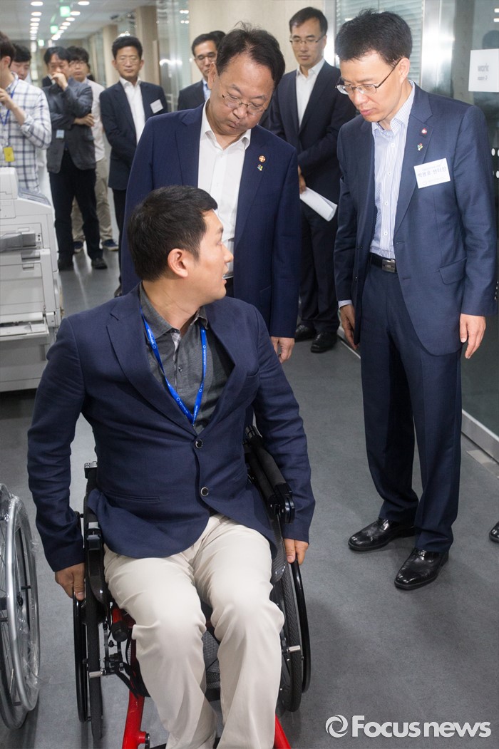 (서울=포커스뉴스) 유일호 경제부총리 겸 기획재정부 장관이 15일 오전 서울 종로구 서울창조경제혁신센터 부속 인큐베이팅 센터에서 입주기업을 둘러보던 중 낙상 방지 휠체어 설명을 듣고 있다.