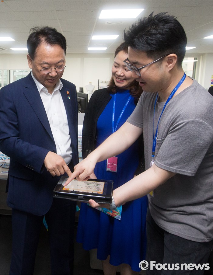 (서울=포커스뉴스) 유일호 경제부총리 겸 기획재정부 장관이 15일 오전 서울 종로구 서울창조경제혁신센터 부속 인큐베이팅 센터에서 입주기업을 둘러보던 중 교육용 콘텐츠 제품을 시연하고 있다.