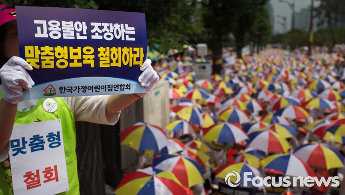 민 대변인은 "실제 지난해 시행한 맞춤형 보육 시범사업에서 전업모가 종일반 80% 중 약 45%에 해당하였음에도 불구하고, 전업모 대 취업모의 갈등 구도로 문제를 호도해 제도의 취지를 왜곡하고 있는 것은 큰 문제"라며 "여야합의를 통해 예산이 확정된 정책인 만큼 시행 철회를 주장하는 것은 국민에 대한 약속을 저버리고 여야 합의를 파기하는 것"이라고 비판했다.(서울=포커스뉴스) 13일 오후 서울 여의도 KB국민은행 앞에서 한국가정어린이집연합회 회원들이 맞춤형 보육 저지 및 평등지원 촉구 결의대회를 하고 있다. 2016.06.13 오장환 기자