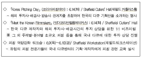 이정구 미래부 방송진흥정책국장은 콘텐츠마켓 참여 등 기존 완성작 위주의 방송콘텐츠 해외 진출 지원에서 벗어나 “방송사‧제작사들이 프로그램 기획 단계부터 국제공동제작을 통해 해외 시장에 능동적으로 대응할 수 있도록 지속적으로 지원해 나갈 예정”이라고 밝혔다.미래부가 영국 셰필드에서 개최한 국내 다큐멘터리 지원행사 주요내용.<표제공=미래부>