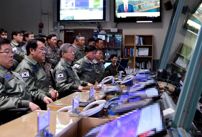 (오산=포커스뉴스) 김희옥 새누리당 혁신비대위원장, 정진석 원내대표 등 의원들이 15일 경기도 오산 공군작전사령부를 방문해 항공우주작전본부 내 지휘소에서 작전현황에 대한 브리핑을 받고 있다. <사진제공=공군>