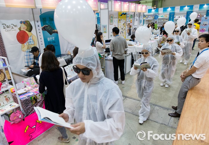 (서울=포커스뉴스) 15일 오후 서울 강남구 코엑스에서 열린 2016 서울국제도서전에서 상상발전소 관계자들이 독서를 장려하는 퍼포먼스를 하고 있다.