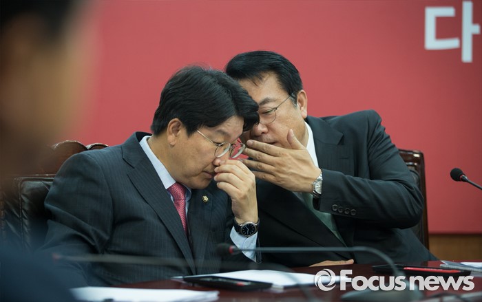 (서울=포커스뉴스) 정진석(오른쪽) 새누리당 원내대표와 권성동 사무총장이 16일 오전 서울 여의도 국회에서 열린 혁신비상대책위원 회의에서 대화하고 있다. 이 회의에서 새누리당 혁신위는 무소속 복당 문제를 논의 한다.