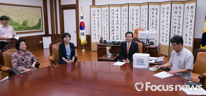 (서울=포커스뉴스) 정세균(오른쪽 두번째) 국회의장이 16일 오전 서울 여의도 국회 의장집무실을 방문한 이정미(왼쪽 두번째) 정의당 원내수석부대표, 가습기살균제 피해자와 가족모임과 면담을 하고 있다.