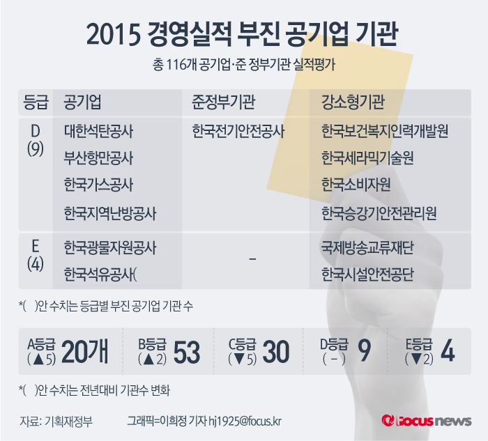 (서울=포커스뉴스) 16일 기획재정부 공공기관운영위원회가 발표한 '2015년도 공공기관 경영실적 평가결과'에 따르면 실적부진(D·E등급) 공기업 기관의 기관장 3명과 상임이사 13명을 경고 조치토록 했다.