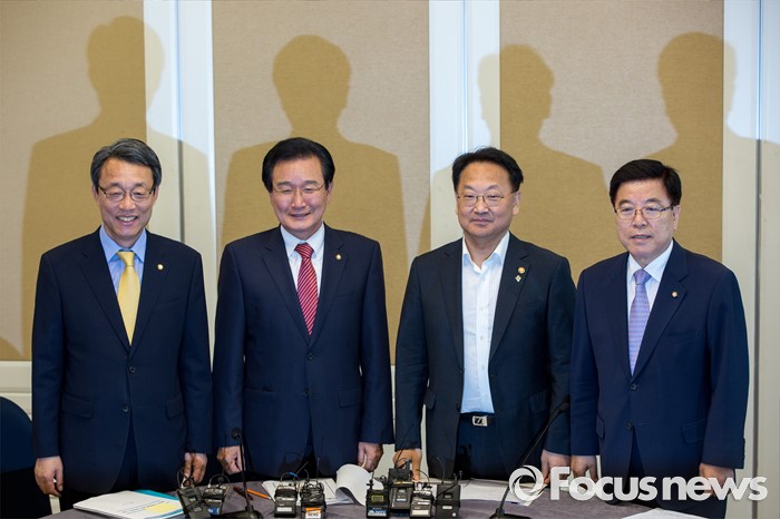 (서울=포커스뉴스) 16일 오후 서울 여의도 국회에서 열린 '2차 민생경제 현안점검회의'에 참석한 3당 정책위의장과 경제부총리가 회의 시작에 앞서 사진촬영 하고 있다. 왼쪽부터 김성식 국민의당 정책위의장, 변재일 더불어민주당 정책위의장, 유일호 경제부총리 겸 기획재정부 장관, 김광림 새누리당 정책위의장.
