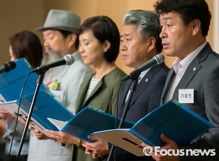 (서울=포커스뉴스) 16일 오후 서울 여의도 국회도서관에서 열린 김근태기념치유센터 개소 3주년 2016 국제 고문피해자 지원의 날 행사에 참석한 기동민(오른쪽부터), 오영훈, 유은혜 더불어민주당 의원 등이 고문피해자들의 내러티브 연극 '진실을 외쳐라'를 하고 있다.