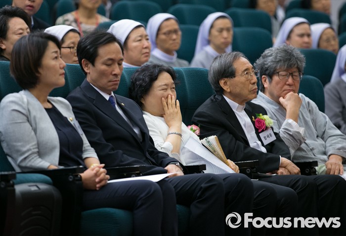 (서울=포커스뉴스) 16일 오후 서울 여의도 국회도서관에서 열린 김근태기념치유센터 개소 3주년 2016 국제 고문피해자 지원의 날 행사에 참석한 이재정(앞줄 왼쪽부터) 더불어민주당 원내대변인, 우상호 원내대표, 인재근 의원, 함세웅 신부 등 참석자들이 고문피해자들의 내러티브 연극 '진실을 외쳐라'를 관람하고 있다.