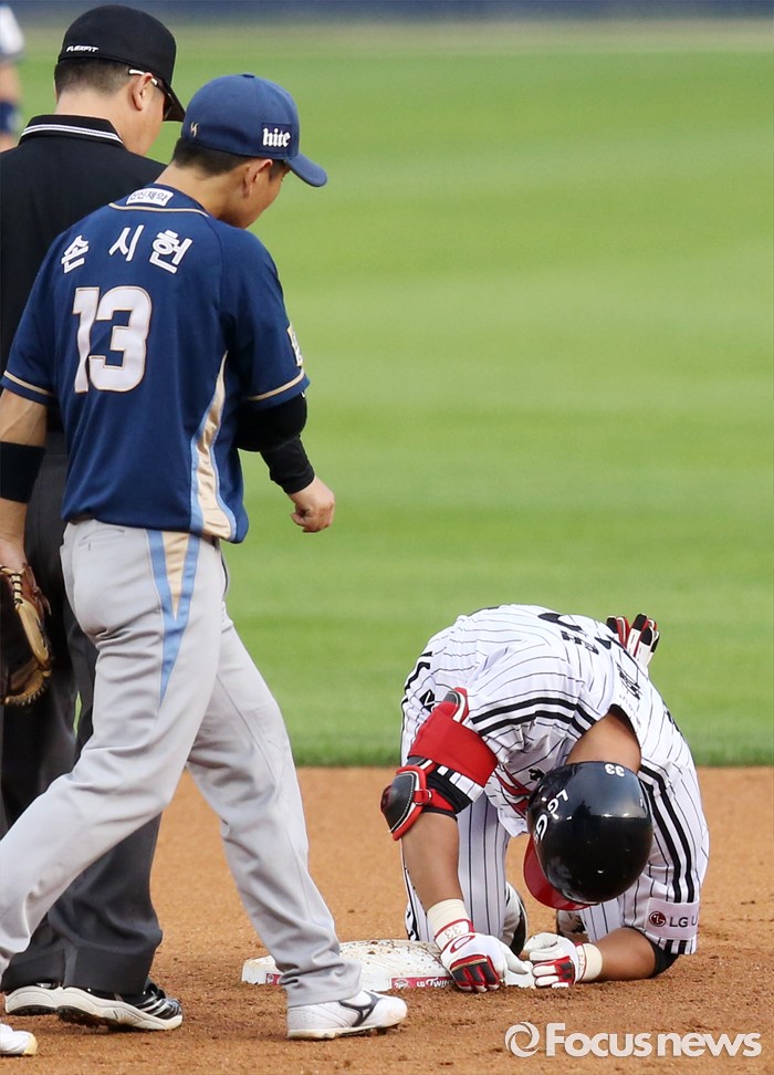(서울=포커스뉴스) 16일 서울 잠실구장에서 열린 2016 프로야구 NC-LG 경기 3회말 1사후 2루에서 슬라이딩하다 왼쪽 어깨를 다친 LG 박용택이 베이스 위에 엎드려 있다.