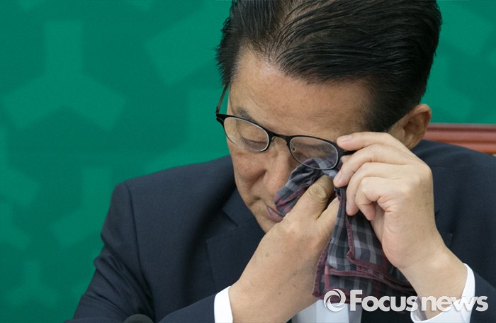 (서울=포커스뉴스) 17일 오전 서울 여의도 국회에서 열린 국민의당 최고위원회의에 참석한 박지원 원내대표가 얼굴을 닦고 있다.
