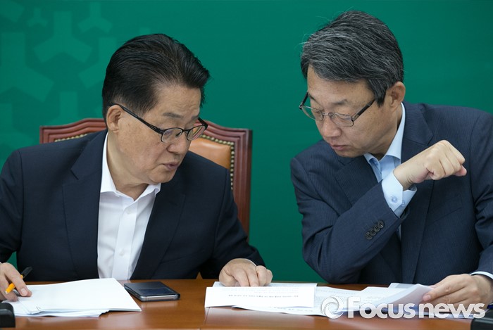 (서울=포커스뉴스) 17일 오전 서울 여의도 국회에서 열린 국민의당 최고위원회의에 참석한 박지원(왼쪽) 원내대표와 김성식 정책위의장이 대화하고 있다.