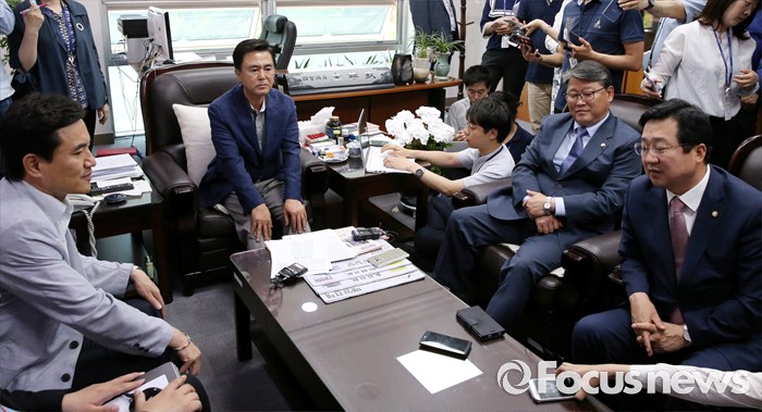 (서울=포커스뉴스) 17일 오후 서울 여의도 국회 의원회관 김태흠 새누리당 의원실에서 조원진, 이장우, 김진태, 김태흠 의원 등 친박계 의원들이 탈당파 복당 문제와 관련 논의를 하고 있다.