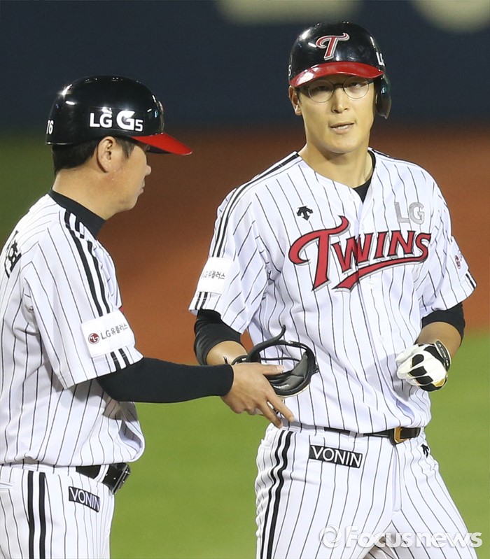(서울=포커스뉴스) 17일 서울 잠실구장에서 열린 2016 프로야구 KIA-LG 경기에서 9회말 2사 2,3루에서 LG 문선재가 2타점 좌중간 3루타를 치고 유지현 코치의 축하를 받고 있다.