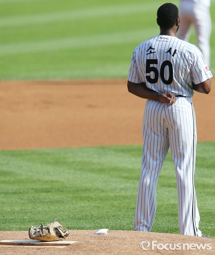 (서울=포커스뉴스) 19일 서울 잠실구장에서 열린 2016 프로야구 KIA-LG 경기에서 1회초 LG 선발투수 소사가 글러브를 투수 마운드 위에 올려 놓고 국민의례를 하고 있다.
