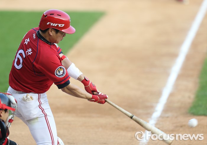 (서울=포커스뉴스) 19일 서울 잠실구장에서 열린 2016 프로야구 KIA-LG 경기 6회초 1사 1,3루에서 KIA 김주찬이 역전 1타점 좌전 안타를 치고 있다.