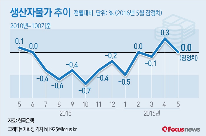 (서울=포커스뉴스) 한국은행이 20일 공개한 '2016년 5월 생산자물가지수'에 따르면 5월 생산자물가지수(2010년 100 기준)는 98.68로 4월 대비 보합을 기록했다. 전년 동월 대비로는 3.1% 떨어졌다.
