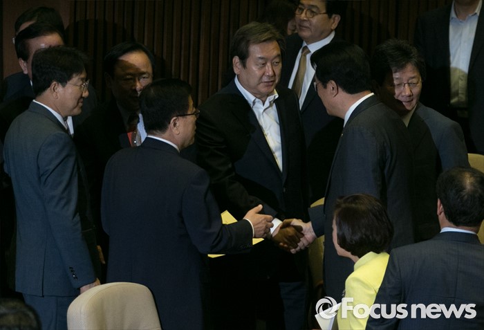 (서울=포커스뉴스) 20일 오전 서울 여의도 국회에서 열린 343회 국회(임시회) 3차 본회의에 참석한 정진석 새누리당 원내대표가 교섭단체 대표연설을 마친 뒤 김무성 전 대표와 악수하고 있다.