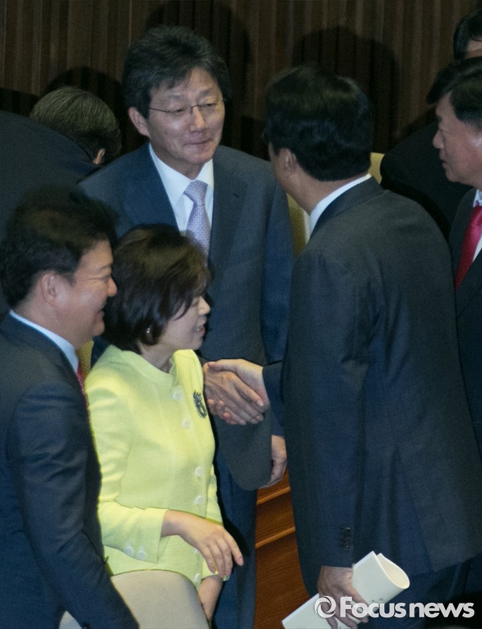 (서울=포커스뉴스) 20일 오전 서울 여의도 국회에서 열린 343회 국회(임시회) 3차 본회의에 참석한 정진석 새누리당 원내대표가 교섭단체 대표연설을 마친 뒤 유승민 의원과 악수하고 있다.