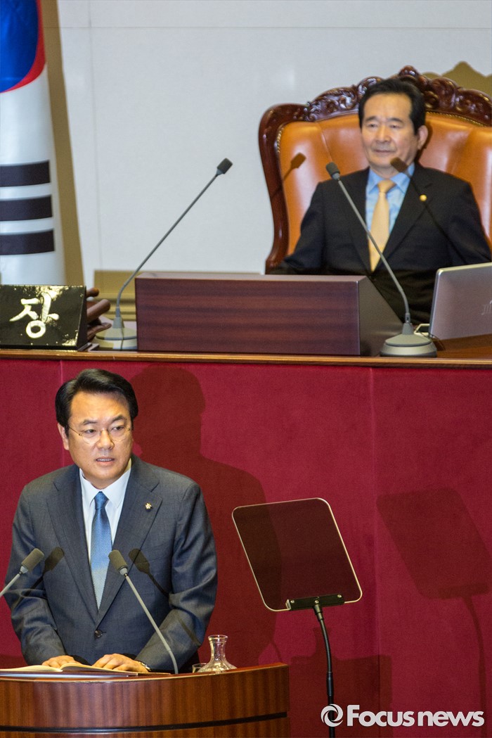 (서울=포커스뉴스) 정진석 새누리당 원내대표가 20일 오전 서울 여의도 국회에서 열린 본회의에 참석해 교섭단체 대표연설을 하고 있다.