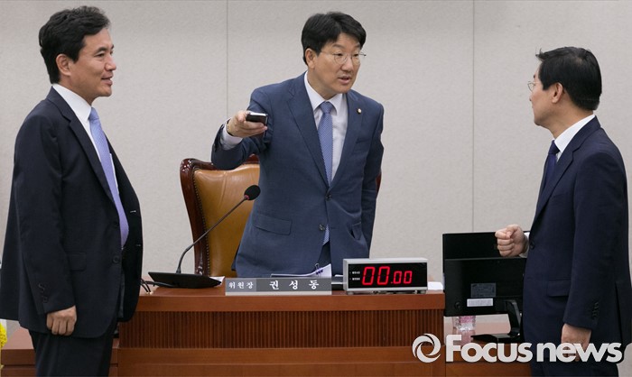 (서울=포커스뉴스) 20일 오전 서울 여의도 국회에서 열린 법제사법위원회 전체회의에 참석한 권성동(가운데) 위원장과 김진태(왼쪽) 새누리당 간사, 박범계 더불어민주당 간사가 대화하고 있다.